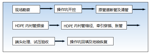 原理:通過對與修復(fù)管道同徑或略小一點(diǎn)的HDPE的縮徑、穿插、脹管等主要工序,實現(xiàn)修復(fù)管道內(nèi)形成與原管道內(nèi)壁緊密貼合的復(fù)合管。